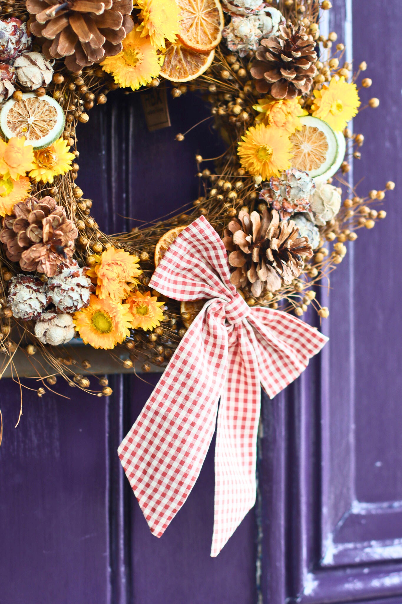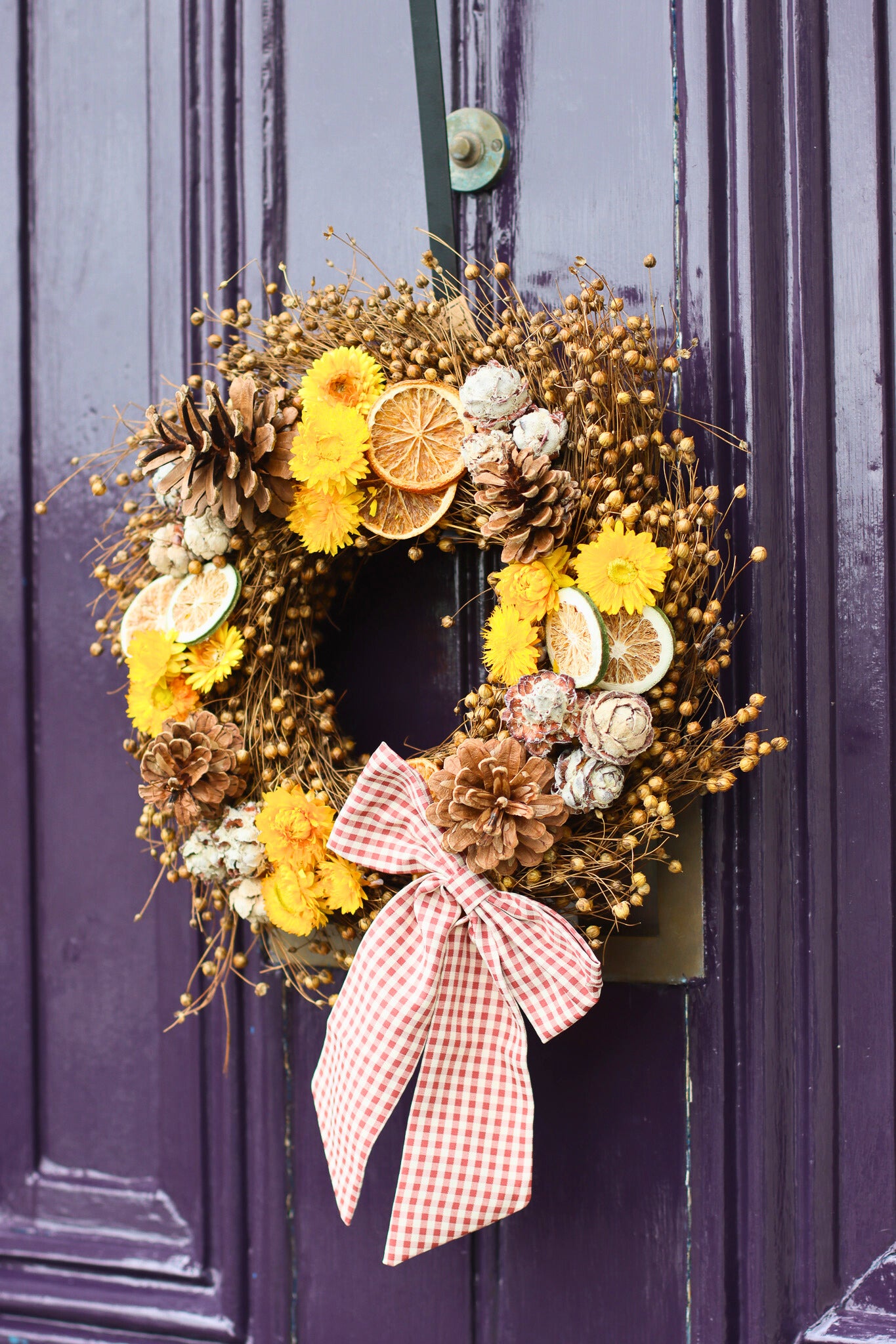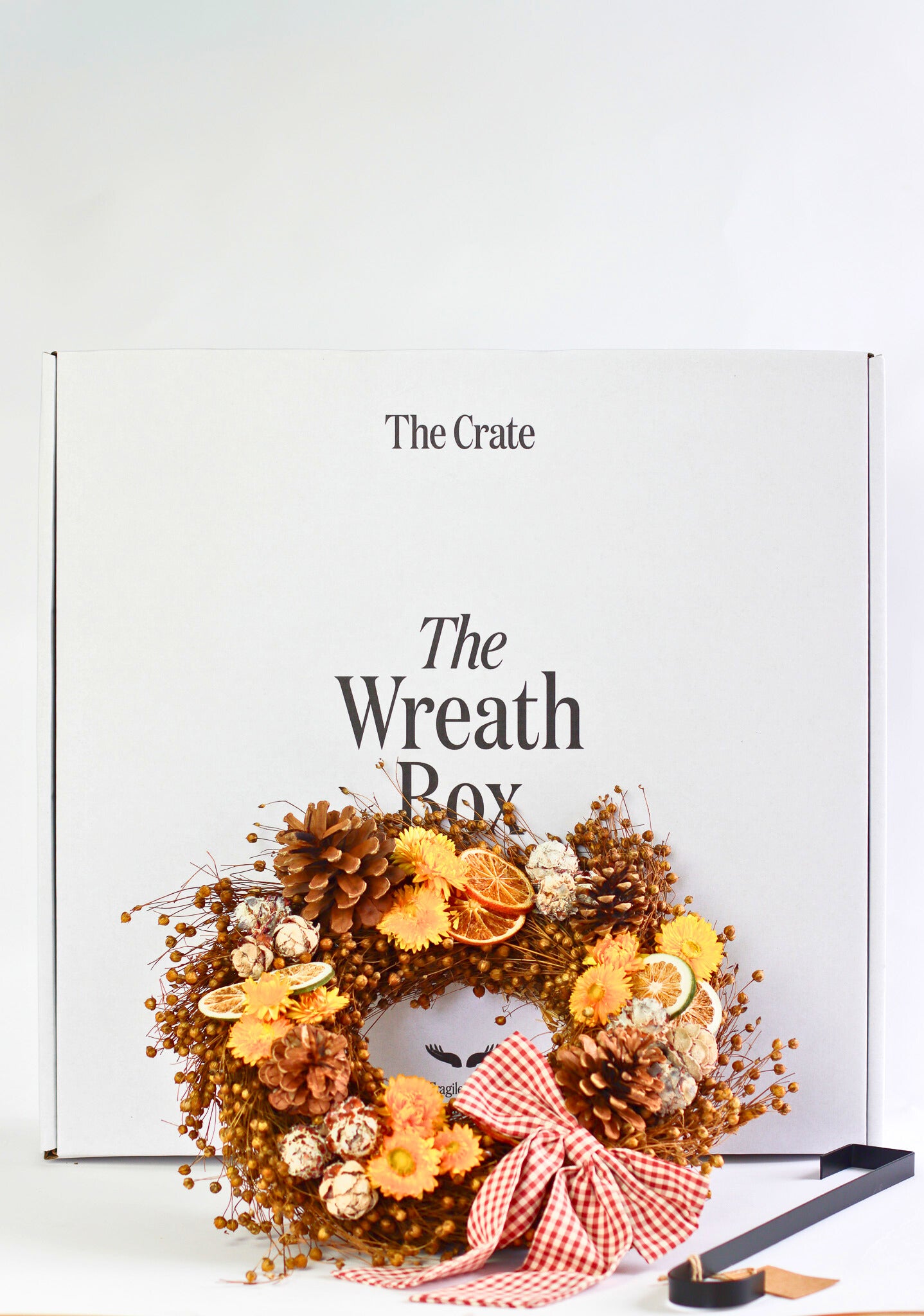 The Crate's dried autumn wreath is perfect for adorning your door and welcoming in the new autumn season. The Autumn Wreath comes with a beautiful black wreath hanger, a large gingham bow for dressing and is delivered in our signature wreath gift box.